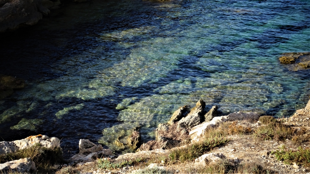 Nous terminons cette belle randonnée et reprenons la voiture à la recherche d’une plage. La guide nous à indiqué une crique assez proche, la « Cala Estreta ». Elle nous a prévenu, le chemin n’est pas vraiment carrossable. Prudents, nous arrêtons la voiture avant les premiers gros trous et continuons le chemin à pieds. Ici, pas de sable fin mais de gros rochers noirs. Peu de monde est venu jusque là, et c’est tant mieux. Nous tombons quand même sur deux jeunes françaises qui nous ont généreusement prêter leurs masques de plongée pour admirer les poissons.